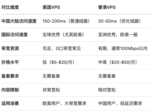 美國VPS和香港VPS的核心區(qū)別在于網(wǎng)絡線路、訪問速度、適用場景和合規(guī)要求。美國VPS優(yōu)勢在于全球訪問速度快、帶寬資源充足且價格較低,適合歐美用戶為主的業(yè)務;香港VPS優(yōu)勢在于中國大陸訪問延遲極低(30-50ms)、無需備案且網(wǎng)絡穩(wěn)定性高,更適合面向中國用戶的外貿(mào)、跨境電商和快速部署業(yè)務。以下是小庫主機小編對美國VPS和香港VPS的區(qū)別對比分析。