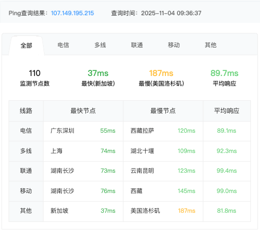 東京:國內三網平均延遲67ms(電信最快31ms,拉薩最慢103ms);