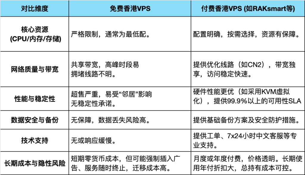 香港 vps 免費 vs 付費核心區(qū)別在于資源保障、性能穩(wěn)定性和長期可用性:免費服務資源受限且存在中斷風險,適合短期測試;付費服務提供穩(wěn)定資源、SLA保障和專業(yè)支持,是業(yè)務上線的可靠選擇。香港vps因其免備案和低延遲的優(yōu)勢,成為眾多用戶部署業(yè)務的熱門選擇。面對市場上免費與付費兩種選擇,了解其根本區(qū)別是做出正確決策的第一步。