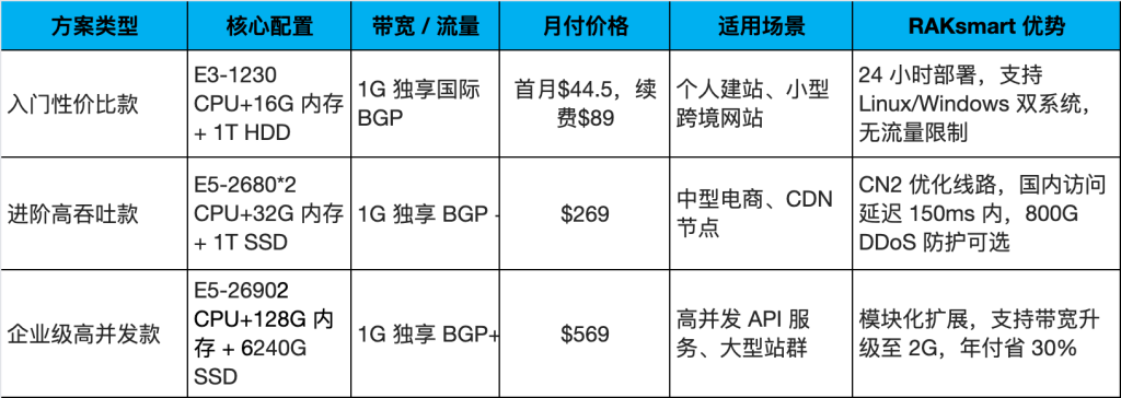 以RAKsmart的硅谷機房產品為例,其方案清晰體現了上述定價邏輯,用戶可按需選擇: