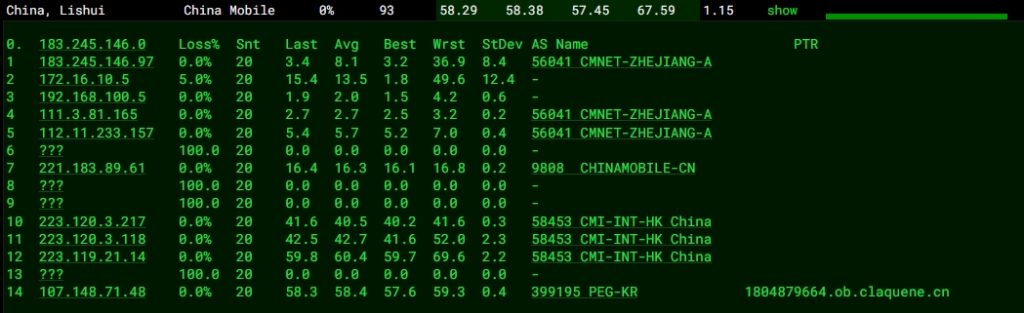 3.4.1 ping.pe 國內移動節(jié)點去程 MTR如下圖
