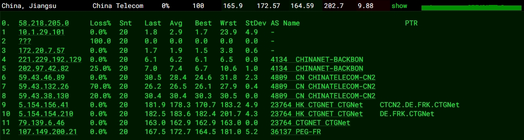 3.2.1 ping.pe 國內(nèi)電信節(jié)點去程 MTR 如下圖
