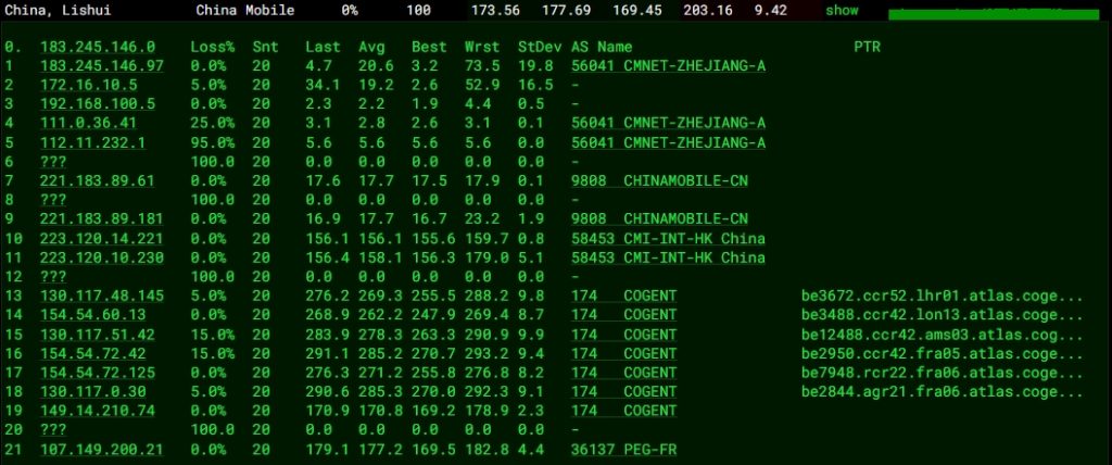 3.4.1 ping.pe 國內(nèi)移動節(jié)點去程 MTR如下圖