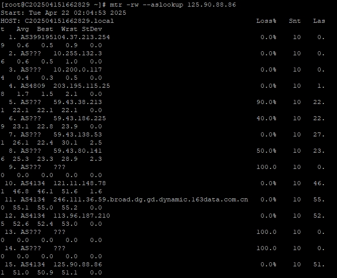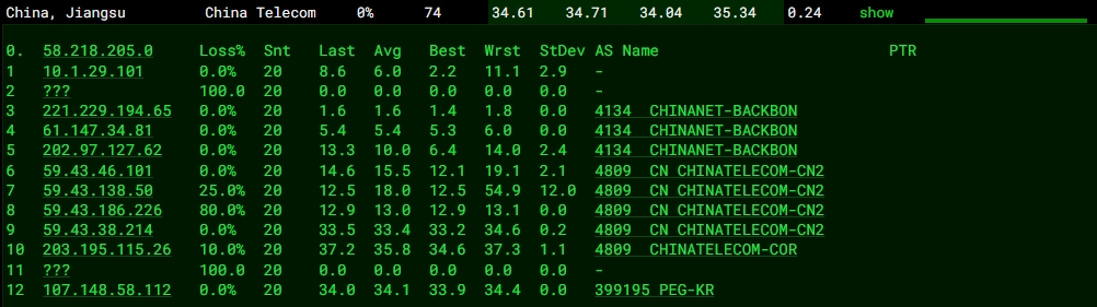 3.5 中國電信回程 MTR 測試 如下圖
