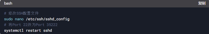 修改默認(rèn)端口:將SSH端口從22更改為非標(biāo)準(zhǔn)端口(如35222),降低被掃描概率: