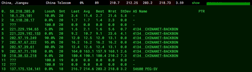 3.5 中國電信回程 MTR 測試 如下圖