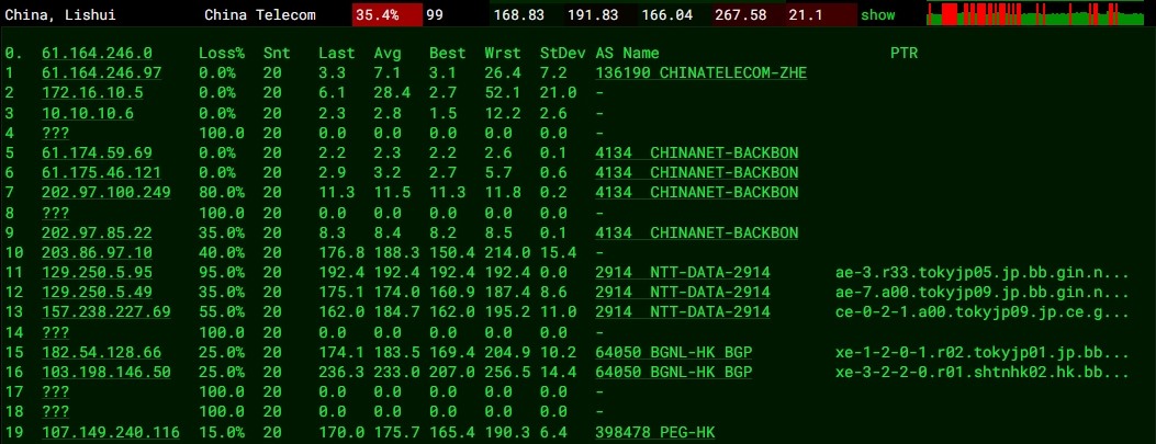 3.5 中國電信回程 MTR 測試 如下圖