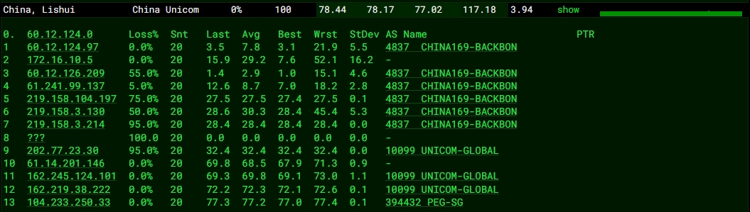 3.6 中國(guó)聯(lián)通回程 MTR 測(cè)試 如下圖